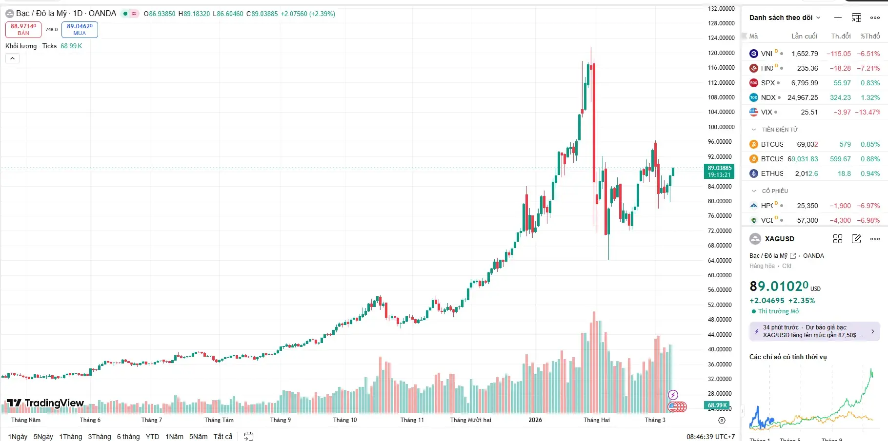 So với mức 80.75 USD của ngày 09/03, giá bạc hôm nay đã tăng vọt thêm 8.26 USD, tương ứng mức tăng trưởng kinh ngạc 10.2% chỉ sau một đêm. Việc giá bạc bứt phá lên sát ngưỡng 90 USD cho thấy tâm lý lo ngại rủi ro của giới đầu tư đang ở mức cực đại. Đà tăng này được củng cố bởi sự suy yếu tạm thời của lợi suất trái phiếu và nhu cầu phòng vệ lạm phát khi giá năng lượng leo thang.