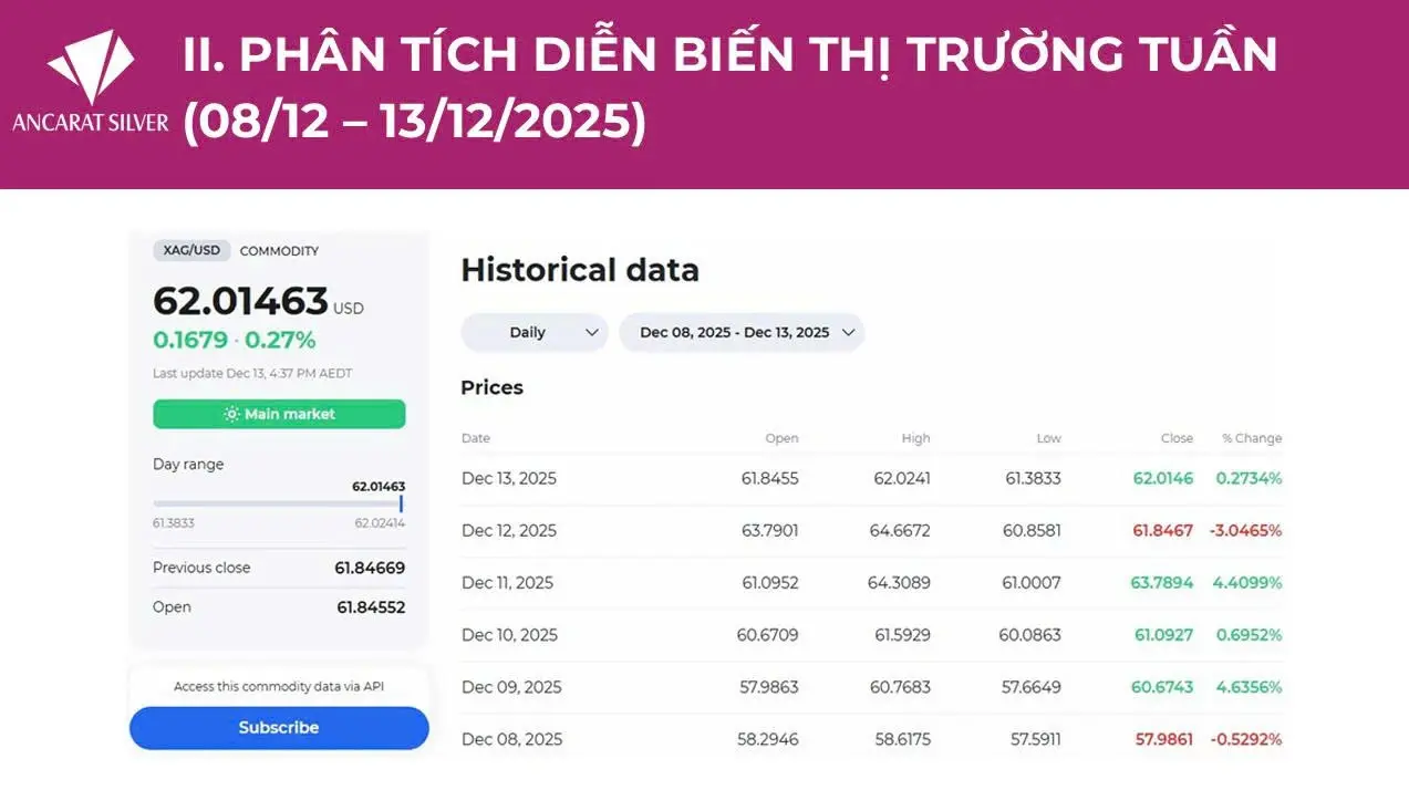 Tuần giao dịch từ ngày 8 đến 13/12/2025 đánh dấu một cột mốc mang tính lịch sử của thị trường bạc quốc tế khi XAG/USD chính thức vượt ngưỡng tâm lý 60 USD/ounce, thiết lập đỉnh cao nhất mọi thời đại tại 64,66 USD/ounce. Đây không đơn thuần là một nhịp tăng giá mạnh, mà là sự xác nhận dứt khoát của cấu trúc tăng dài hạn, được xây dựng qua mô hình kỹ thuật “cup-and-handle” kéo dài nhiều năm.