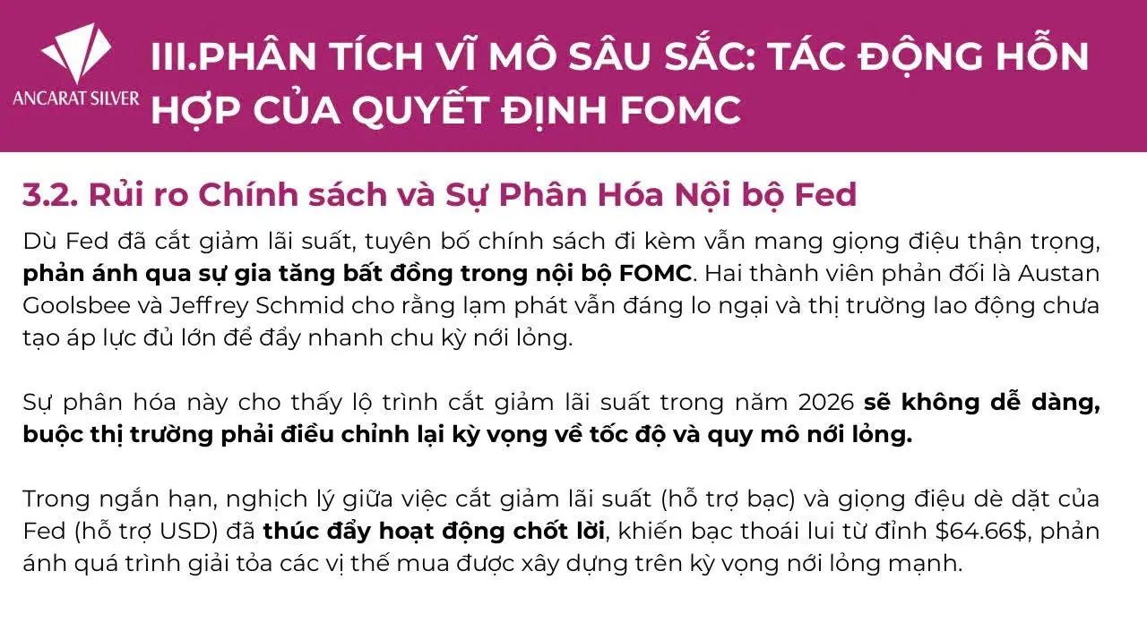 Dù hành động chính sách mang tính nới lỏng, giọng điệu của Fed vẫn thận trọng. Một số thành viên FOMC bày tỏ lo ngại rằng lạm phát chưa hoàn toàn được kiểm soát, khiến triển vọng cắt giảm lãi suất trong năm 2026 trở nên kém chắc chắn hơn. Sự mâu thuẫn giữa hành động và thông điệp này đã góp phần kích hoạt nhịp chốt lời mạnh, kéo bạc rời khỏi vùng đỉnh 64,66 USD.