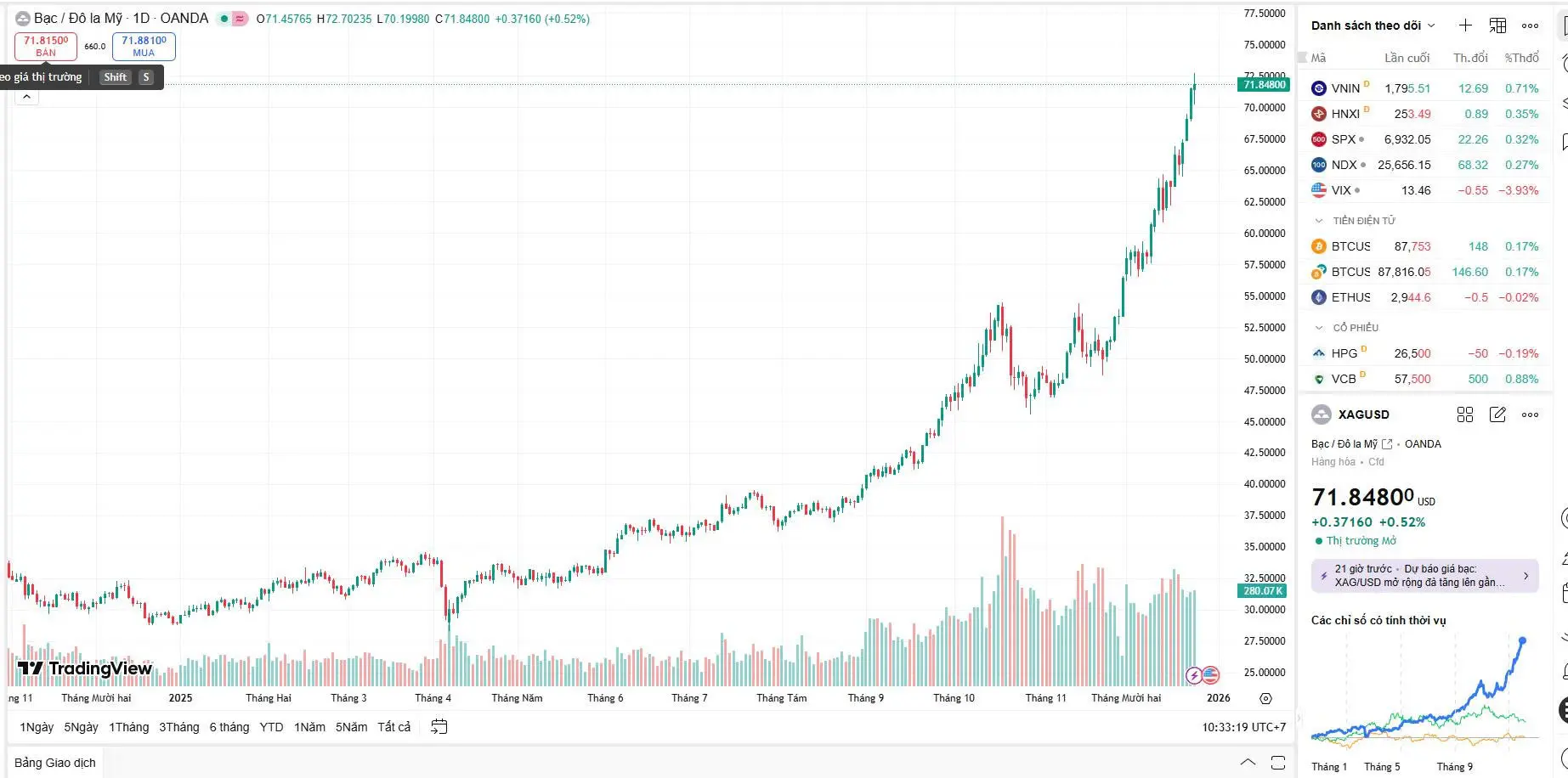 Tâm điểm của giá bạc hôm nay là việc kim loại quý này không giữ vững được mốc tâm lý quan trọng 72 USD thiết lập ngày hôm qua. Hiện tại, giá bạc giao ngay (XAG/USD) đang giao dịch quanh mức 71.8 USD/ounce.