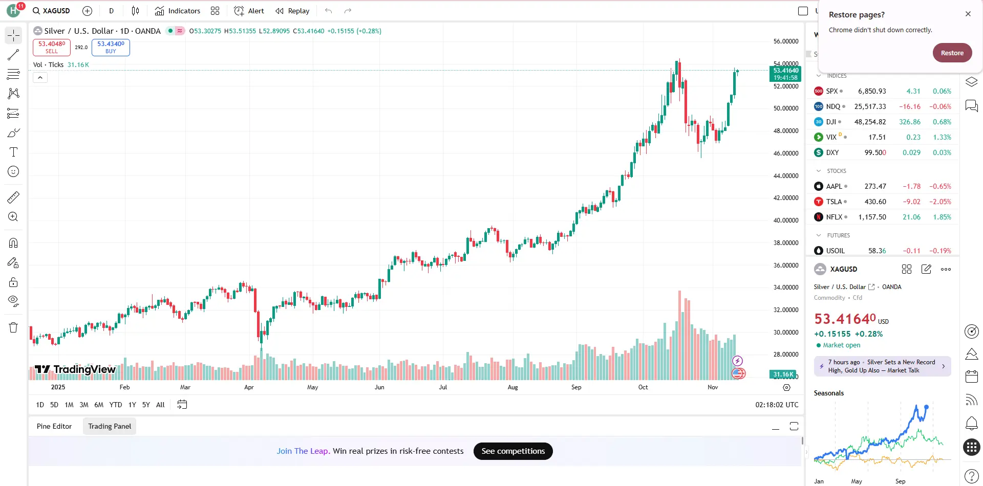 Theo dữ liệu từ Dow Jones Newswires, giá bạc trên sàn Comex (Mỹ) đã có một phiên tăng "dựng đứng", chốt phiên (settle) tăng vọt 5.36% lên mốc 53.332 USD/ounce. Đây là một trong những phiên tăng giá mạnh nhất trong nhiều năm, đẩy giá kim loại quý này vượt qua cả đỉnh cũ. Nhìn vào biểu đồ giá bạc (XAG/USD) trên sàn quốc tế: